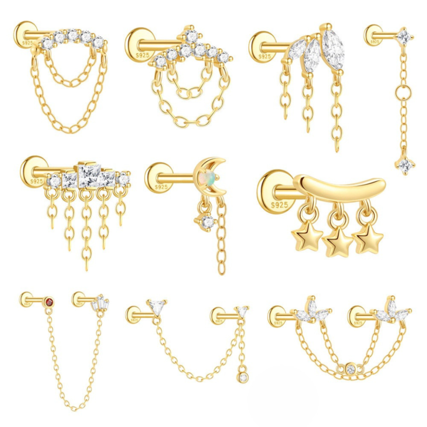 925 Silver Gold Plating Zircon Piercing Earrings 0.7g 14x11mm